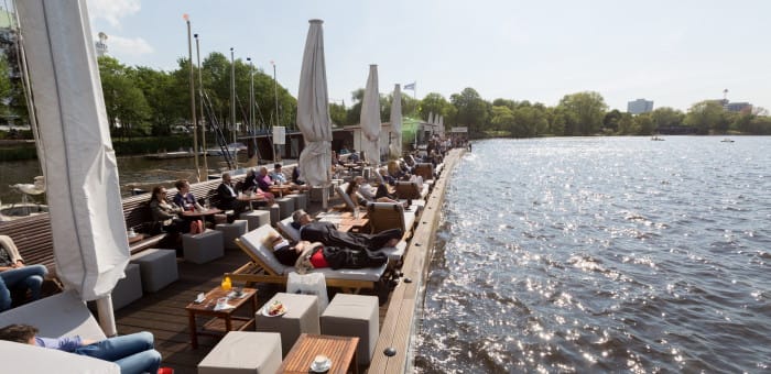 Die Outdoor-Lounge a.mora mit dem schönsten Blick auf die Alster. Den einmaligen Blick auf kreuzende Segelboote und berauschende Sonnenuntergänge krönen die Jungs und Mädels mit feinsten Speisen und Getränken, bequemen Sonnenliegen und entspannten DJ-Beats!